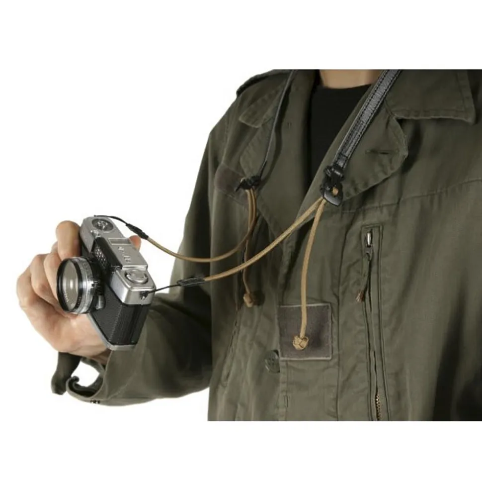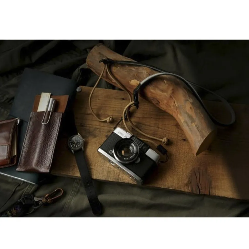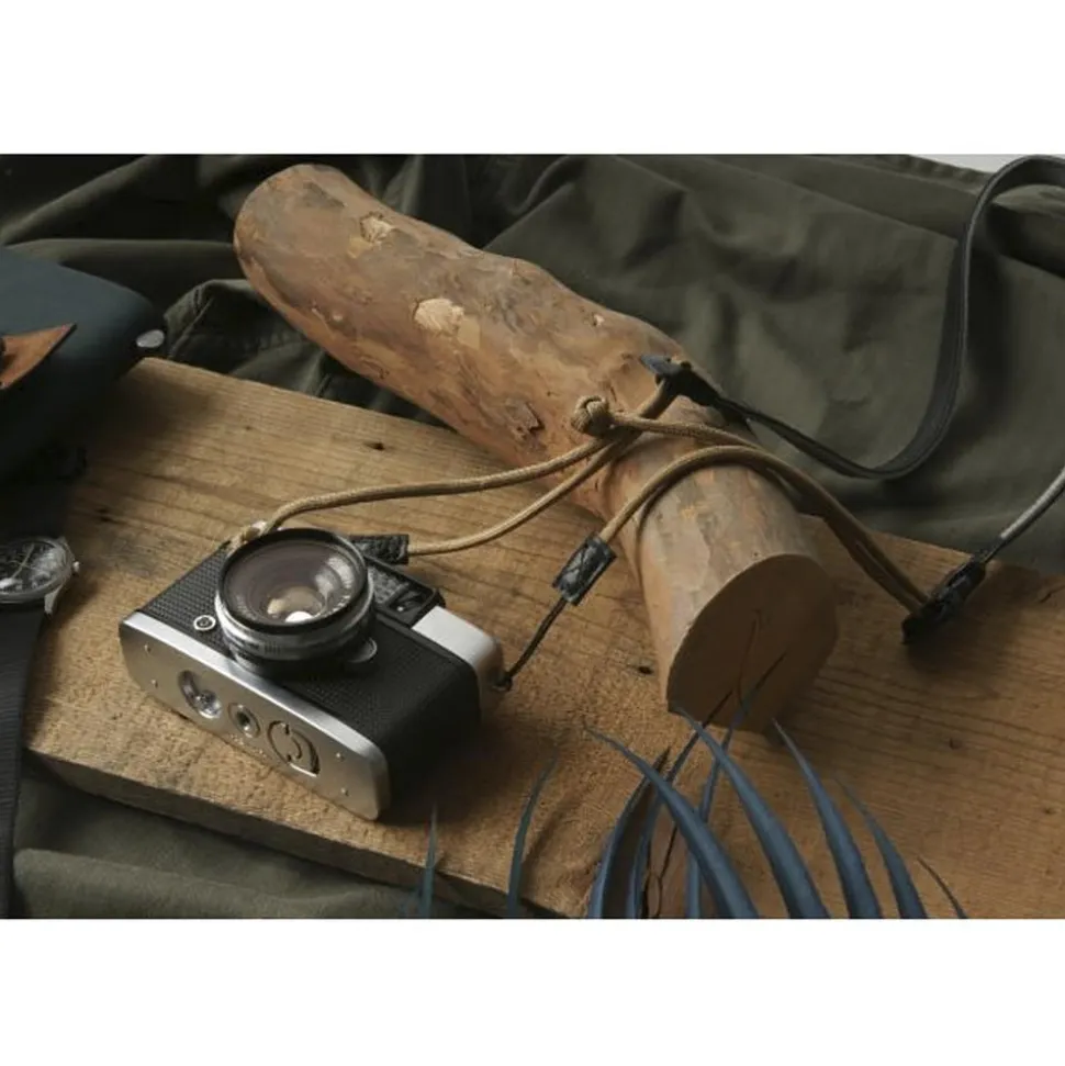 The “Flynn Camera Strap” is inspired by the paracord strap used on American photojournalist Sean Flynn’s camera. It features durable materials, paracord, and leather, known for its load-bearing capabilities.