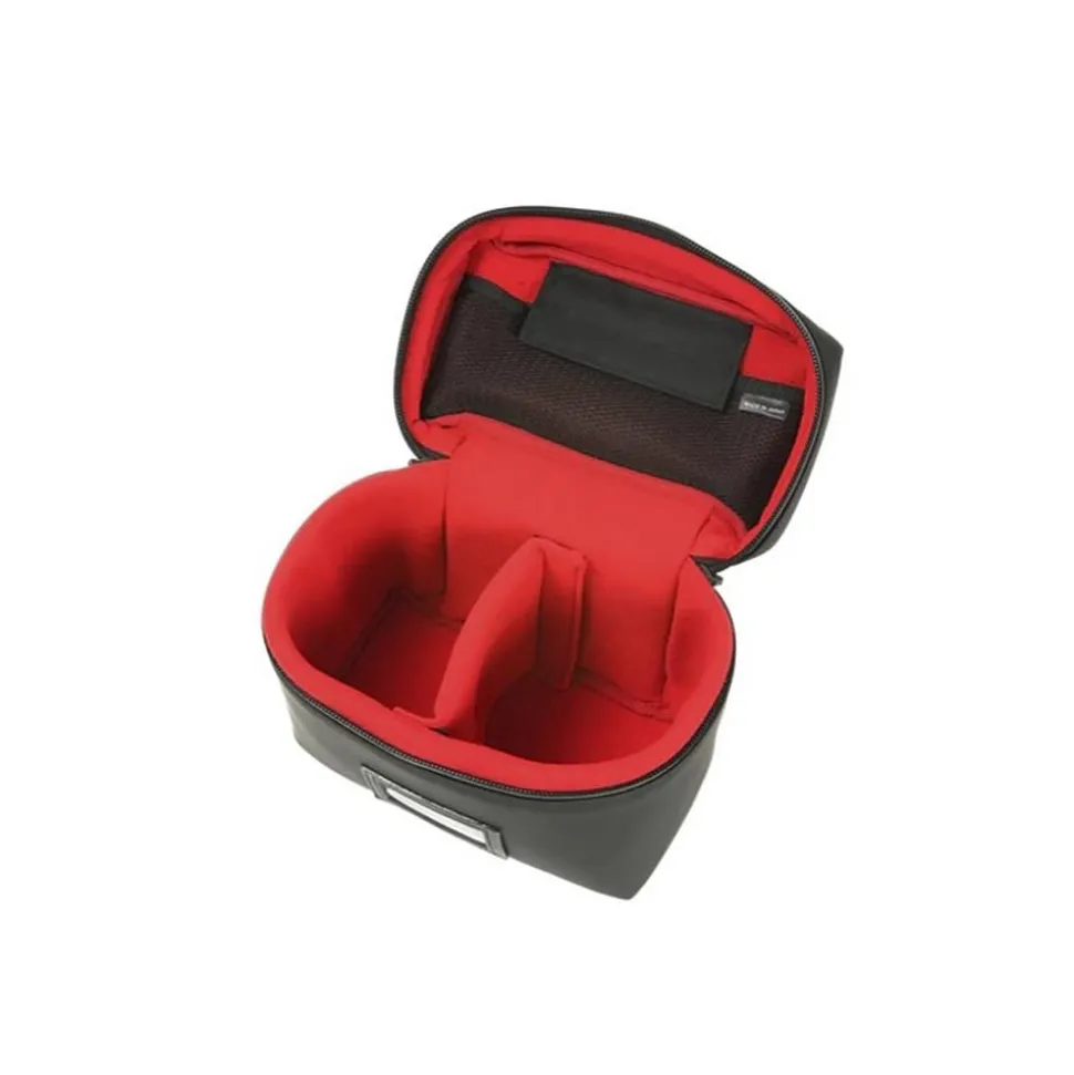 The vibrant red inner cushioned lining and dividers provide ample protection for the camera. To prevent the zipper from coming into contact with the equipment inside when opening and closing the pouch, the inner walls are taller than the zipper. The interior mesh pocket on the top inner side of the pouch is ideal for storing small items like SD cards. The label holder on the front facilitates smart organization, and the handle allows for easy retrieval from bags or storage areas.