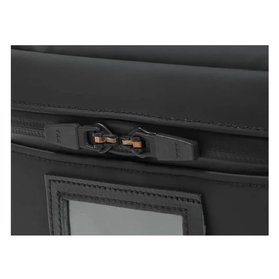 Every element, from the handle to the zippers and pullers, is unified in a sleek matte black color.