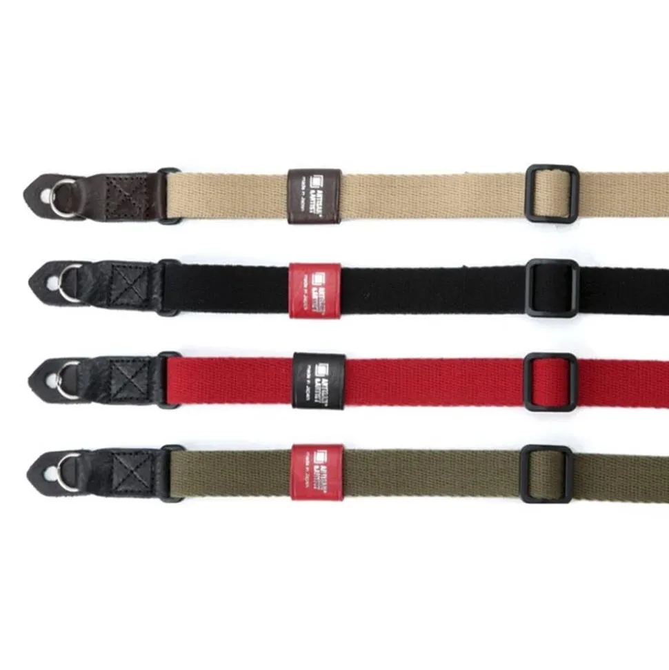 A slim camera strap for Leica M type or mirrorless camera featuring a ring-type attachment system. Made of acrylic tape, the strap is soft and can accommodate various carrying styles.