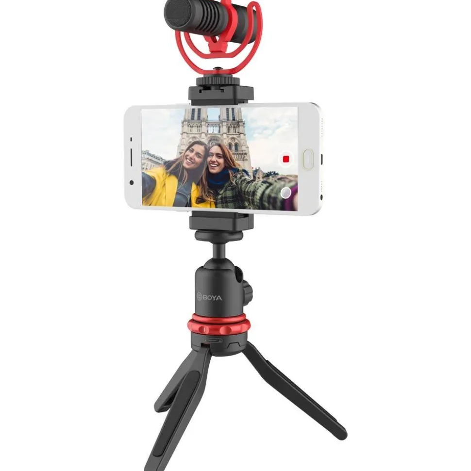 - Includes BY-MM1+ shotgun microphone, LED light, smartphone clamp, ball head, extension tube, mini tripod, clamp with cold shoe mount from