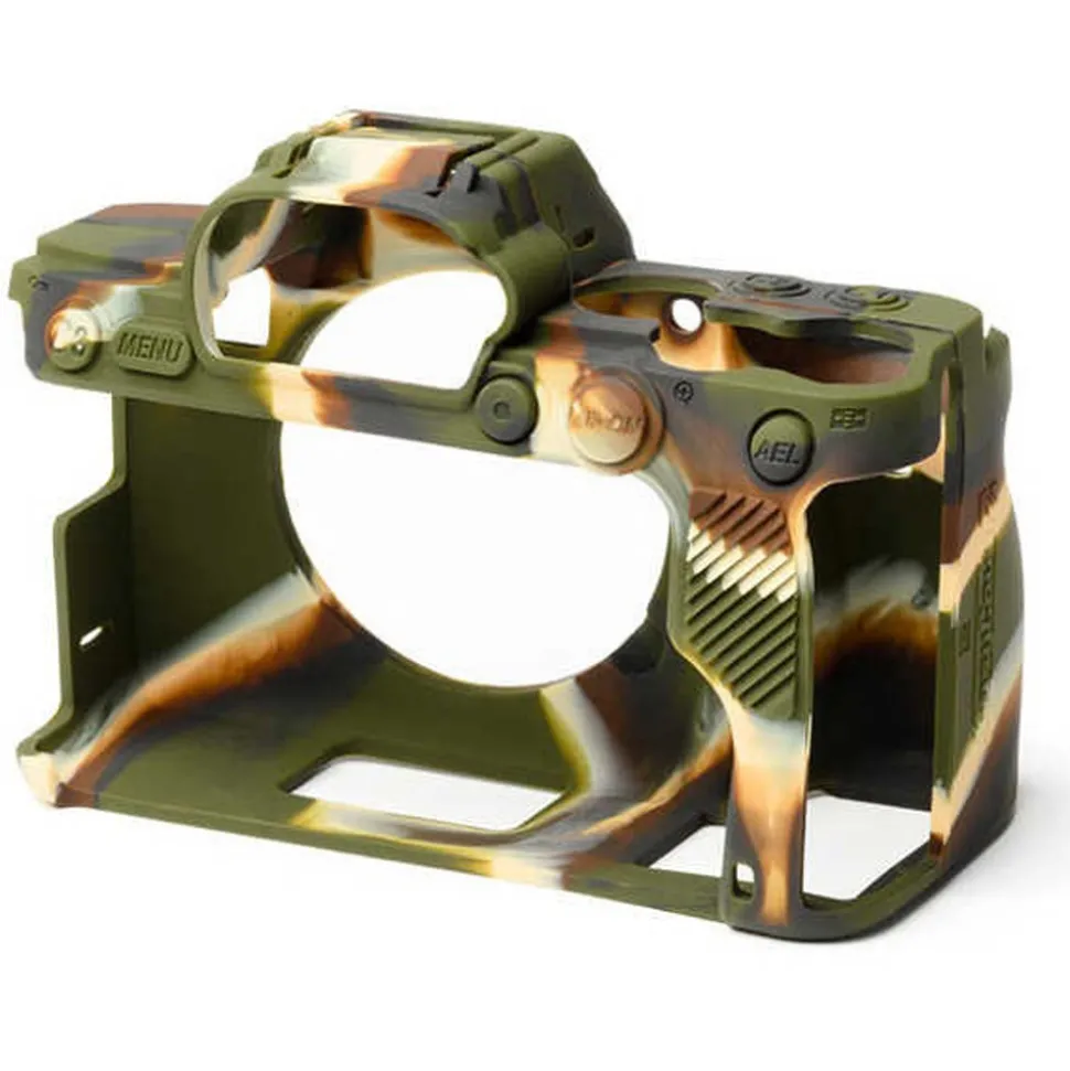 Custom fitted silicone case for the and cameras in camouflage pattern, ideal for wildlife photographers.