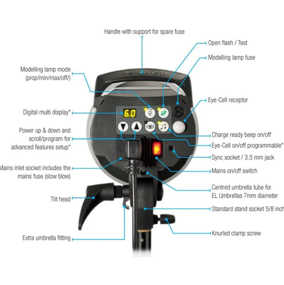 – Radio Remote Control of flash power settings, Modelling lamp on/off, Speed sync mode and Triggering.