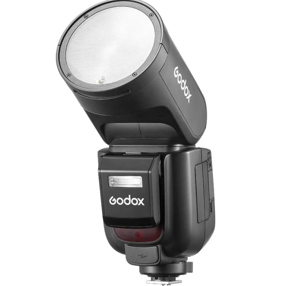 The V1PRO C is a professional flash unit with round flash reflector and battery.