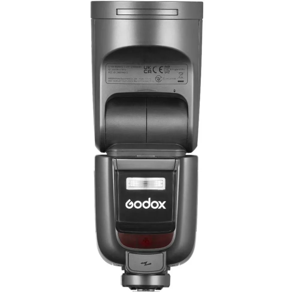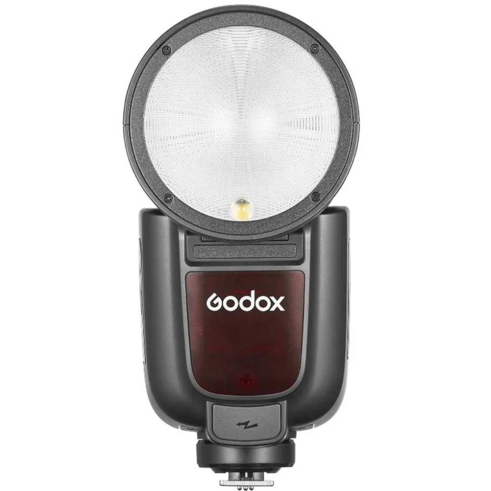 The V1PRO C is a professional flash unit with round flash reflector and battery.