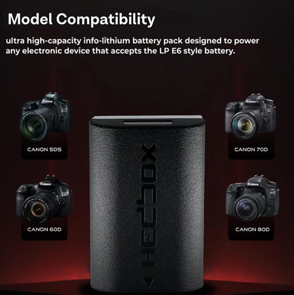 Small and lightweight, the HED-LPE6H is an ultra high-capacity info-lithium battery designed to power any Canon DSLR camera, including a multitude of other units that accept the Canon LP-E6 style battery mount. With the high quality cells, the stability and performance in the studio and the field are always guaranteed