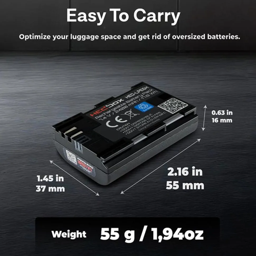 Hedbox HED-LPE6H 17.8Wh 2400mAh DV Battery Pack for Canon – Li-Ion Battery 7.4V (LPE6). Hedbox HED-LPE6H DV Battery Pack is an ultra-high power capacity 17.8Wh 2400mAh Lithium-Ion battery designed to power Canon DSLR cameras as well as a multitude of third-party peripherals and devices that accept Canon LPE6 style batteries.