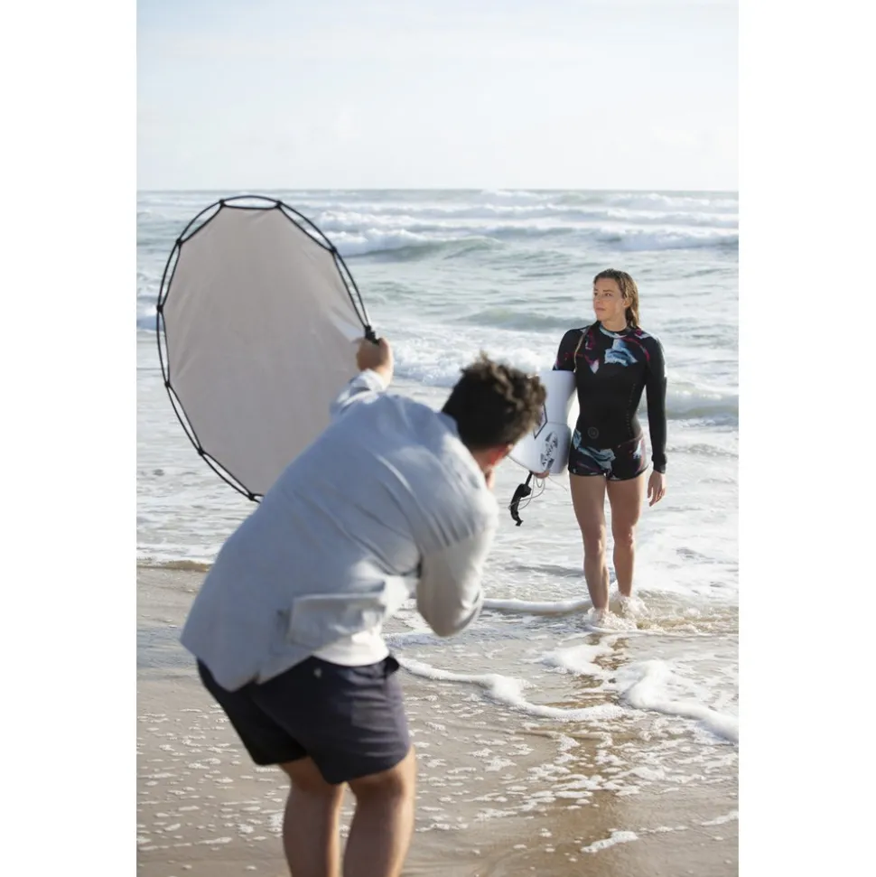 | The HaloCompact is a patent pending design concept that makes the everyday reflector and diffuser panel even more portable than ever! Unlike many traditional reflector/diffuser panels that incorporate a steel rim pop up design, the 82cm (32”) HaloCompact is constructed using Manfrotto By Manfrotto’s new innovative RapidExoframe technology. The collapsible lightweight aluminium frame quickly slots together and the reflector or diffuser fabric cover simply clips onto the frame. The cleverly designed RapidExoFrame construction allows the frame to breakdown into small multiple sections and along with the folded fabric packs into a carry case measuring only 6.5 x 27 x 6.5cm (2.5” x 10.5” x 2.5”) weighing only 335g (reflector and case). The new HaloCompact surfaces are available as full solutions with the RapidExoframe or as covers only for existing users who already have a frame. The Sunlite surface features a combination of silver and gold stripes offering a slightly warmer reflective tone than the standard full silver. Ideal for warming skin tones and shooting during golden hour, complementing the warm colours of the sun. The Soft Silver surface features an even combination of silver and white stripes, positioning its reflective qualities between a full silver and a full white surface. An ideal solution for adding that little bit of extraa fill when needed, whilst not being too overpowering. |