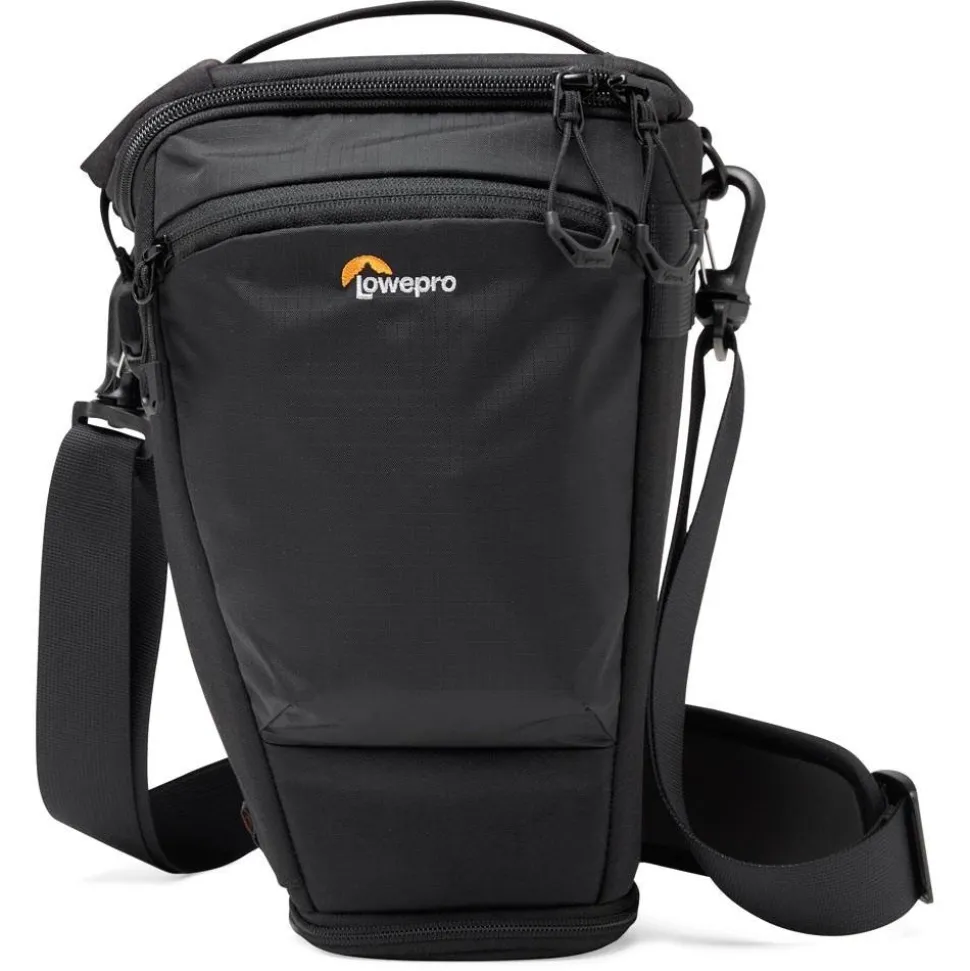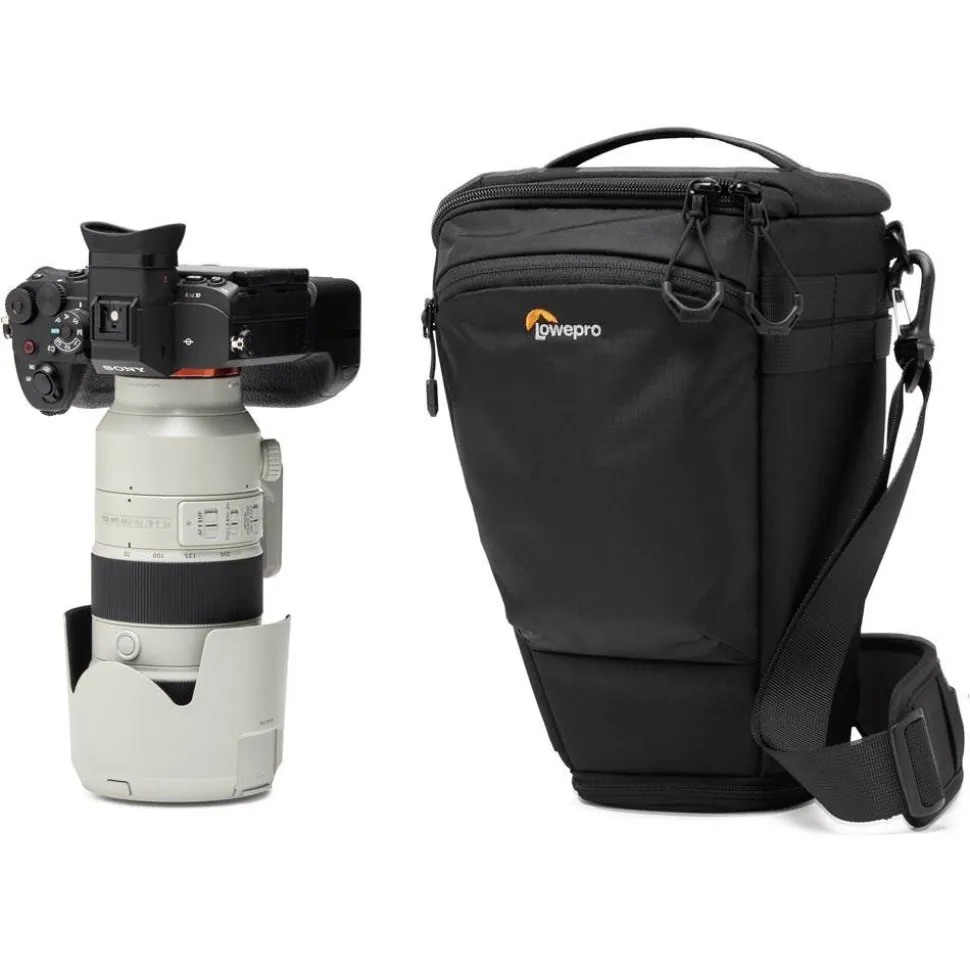 Introducing the ProTactic TLZ 75 Pro AW III, designed for the working photographer shooting events and other jobs all day, largely outdoors. This toploader is sized for a full-frame body with a portrait grip and up to a non-telescoping 70-200 f2.8 lens attached. The bag features an expansion section to accommodate a lens hood in shooting position, and the door wraps to the side for easier grip access. The quick-close buckle allows for fast access or extra security, while the interior divider holds the camera near the top for easy removal or divides the bag for a two-lens kit.