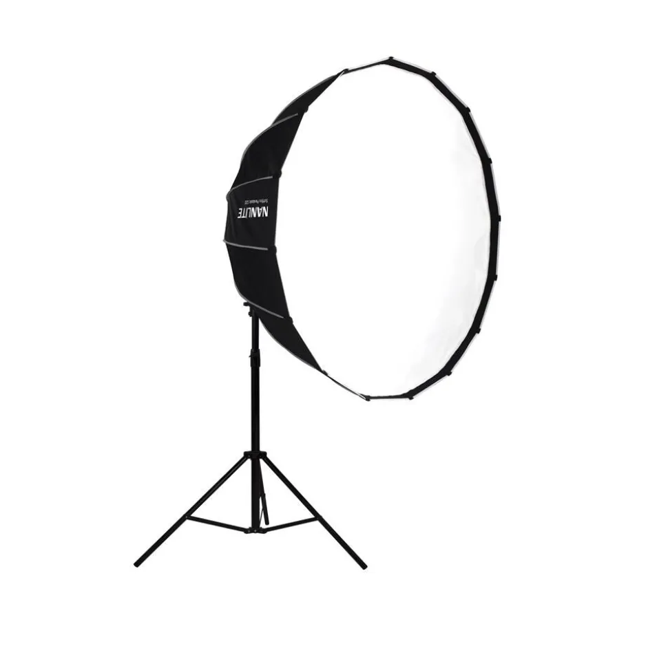 The NANLITE 120cm Easy-Up parabolic softbox features a Bowens Mount and serves to enhance light direction and reduce spill, the Easy-Up mechanism allows for easy setup and pack down anywhere. The silver lining allows for usage as a large reflector without diffuser outputting high-contrast light, Ideal for many stills and motion productions