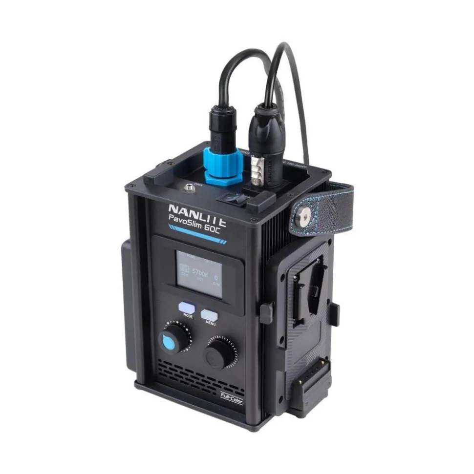 The Nanlite PavoSlim 60C is an exceptionally thin and lightweight 1×1 RGBWW LED panel light that provides impressive output (7074 lux, 657.2 fc @1M 5600K), 0–100% dimming, a bi-color CCT range of 2700K–7500K with G/M adjustment of +/- 150, built-in CRMX LumenRadio, power through AC, NP-F or V-Mount battery, and includes a Control Unit, super clamp, softbox, 2 sets of diffusion, eggcrate grid, a swivel mount, a baby-pin mount, and a compact padded carrying case that safely holds everything.