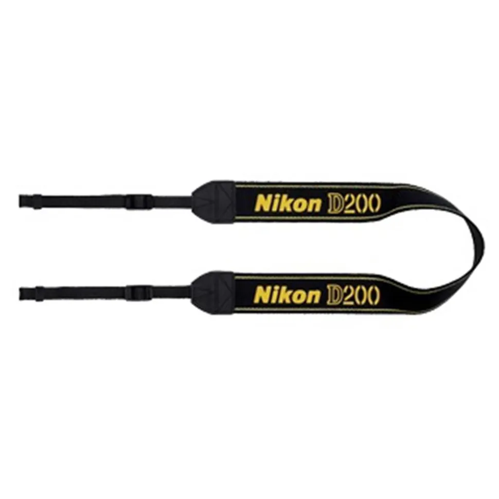 | Replacement shoulder strap for the Nikon D200 DSLR, made from woven black fabric with embroidered camera name and Nikon logo. |