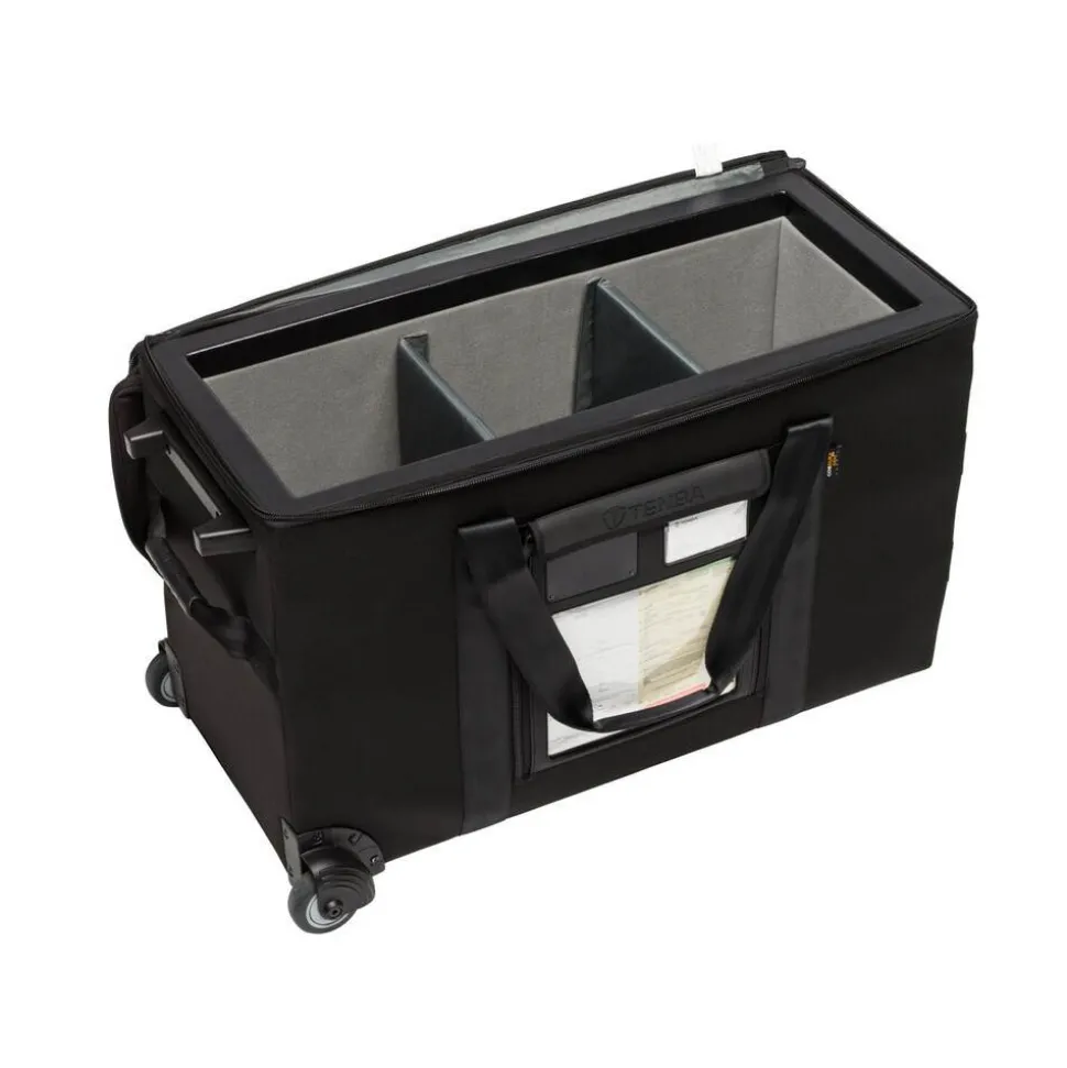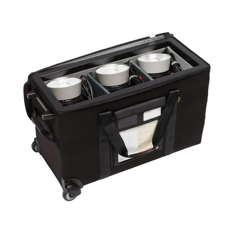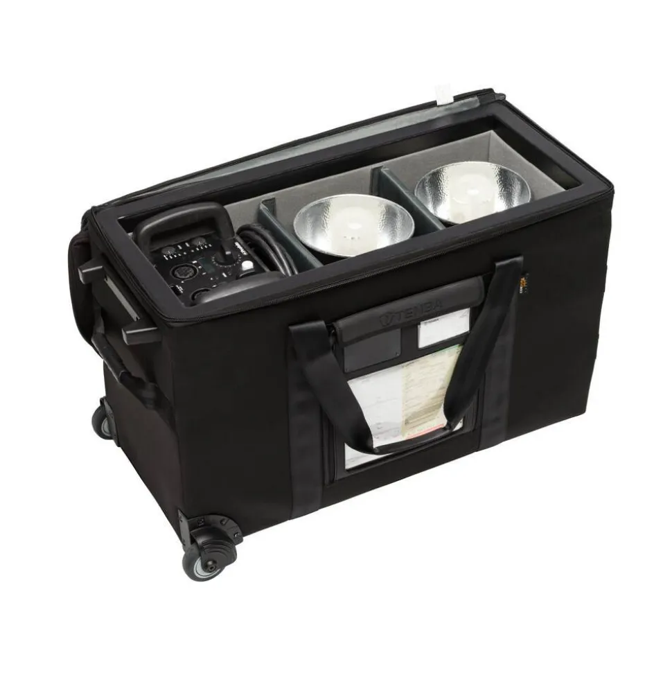 A shippable, airport checkable and virtually uncrushable case that fits a professional lighting kit with a generator and 3-4 heads. This case is preferred by rental companies around the world for its versatility, as it fits many different configurations and brands of lights. Tenba’s patented Air Case construction provides the protection of a hard case at a fraction of the weight, and the corner-mounted wheels give it a wide, stable wheelbase and ensure it’s easy to move, even when fully loaded. Adjustable padded dividers allow gear to be compartmentalized for improved protection. Exclusive Datapanel™ integrates shipping document window and identity/business card pockets.