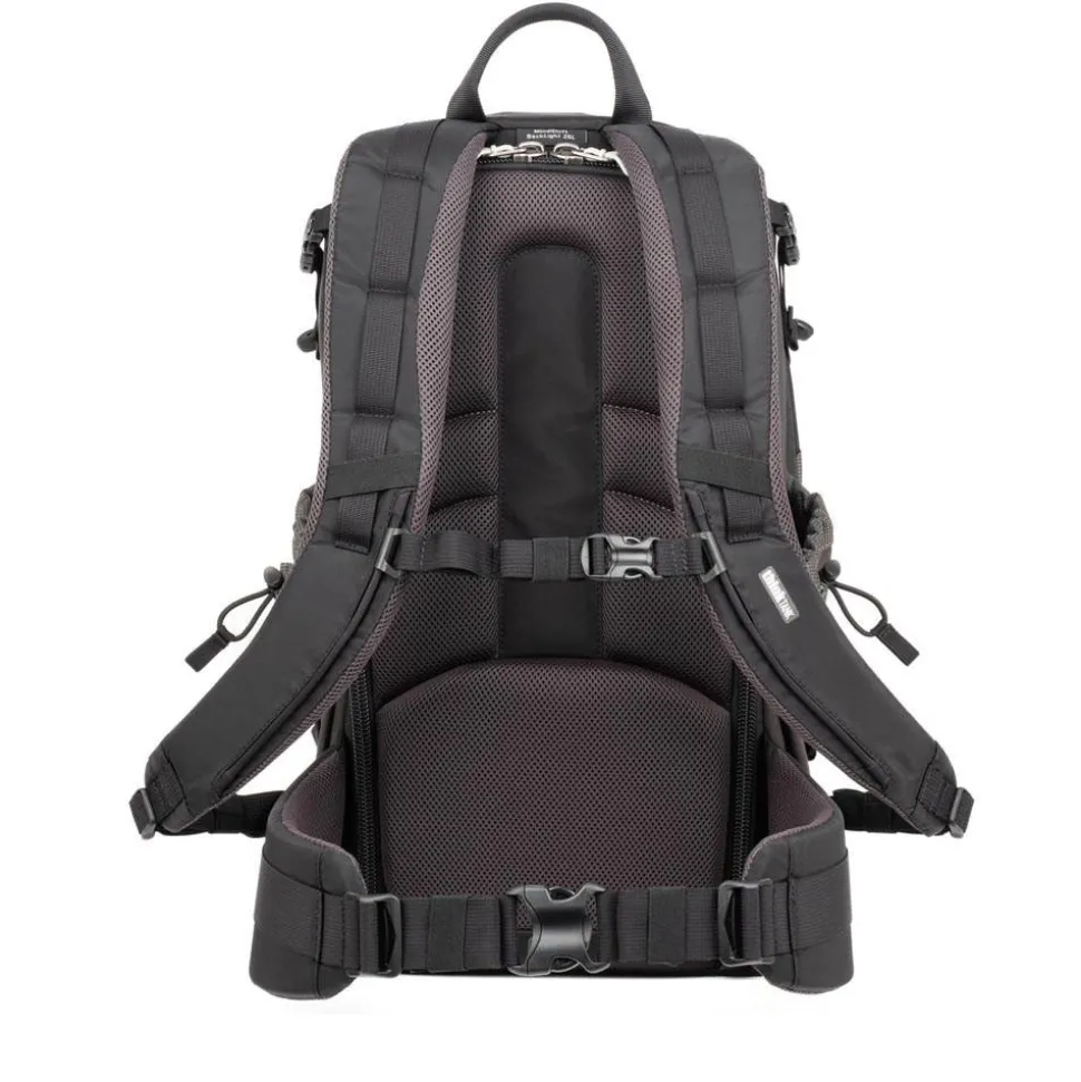 - Padded waist belt for all-day comfort on the trail with webbing rail for attachment of additional Think Tank accessories