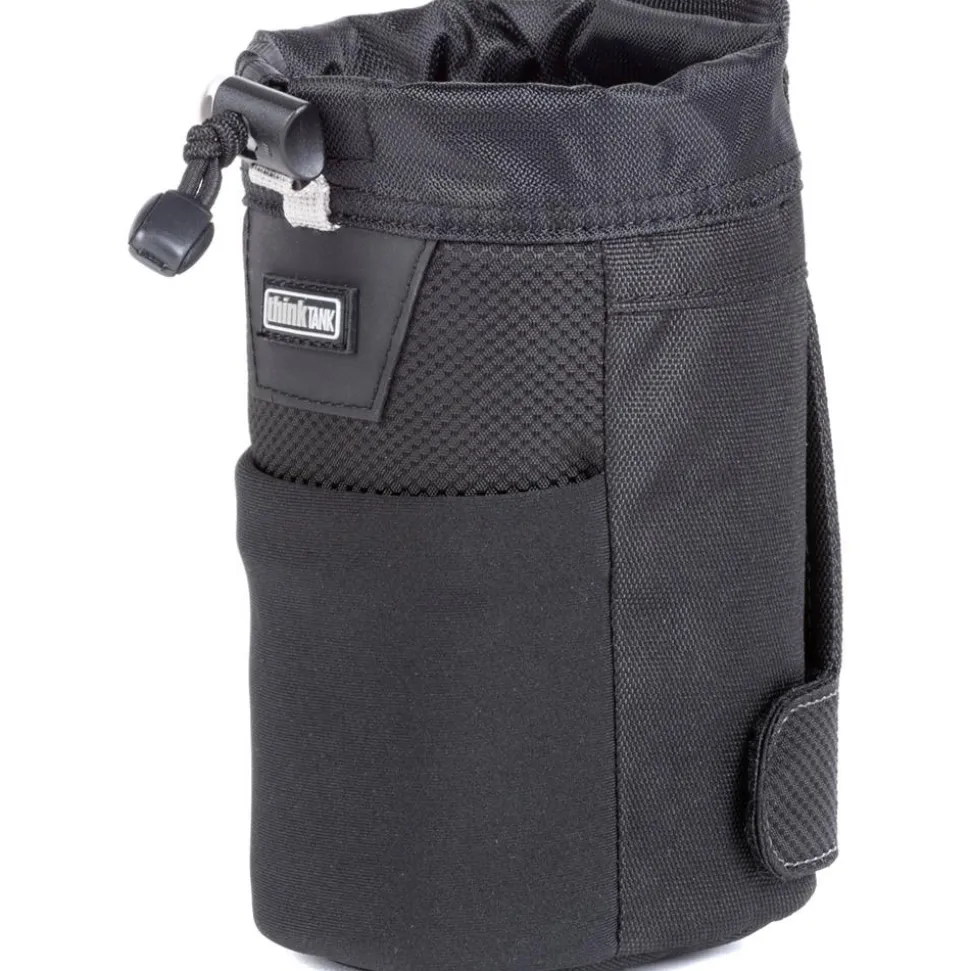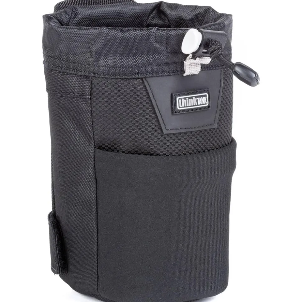 Part of the modular belt system, this black Lens Changer 15 V3.0 from Think Tank is a water-resistant nylon pouch designed for holding short prime lenses such as the 50mm f/1.4 and 85mm f/1.8. The lens case attaches to any optional Think Tank belt or backpack, so you can easily use it while shooting for switching lenses on the go. Made of nylon and polyester, the pouch features a water-repellent coating on the outside for increased durability, and comes with a rain cover in its bottom pocket that can be easily deployed in inclement conditions. Its mouth opens wide for quick access to your gear and closes via a simple drawstring. An outer stretch pocket is available for storing a lens cap or other small item, while a grab handle allows you to easily carry the case with your hands when needed.