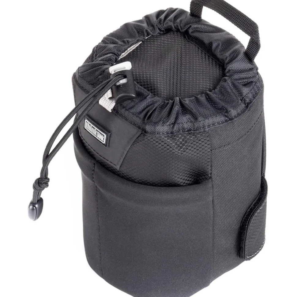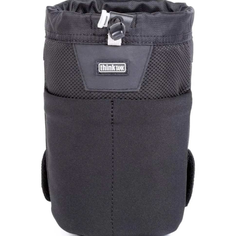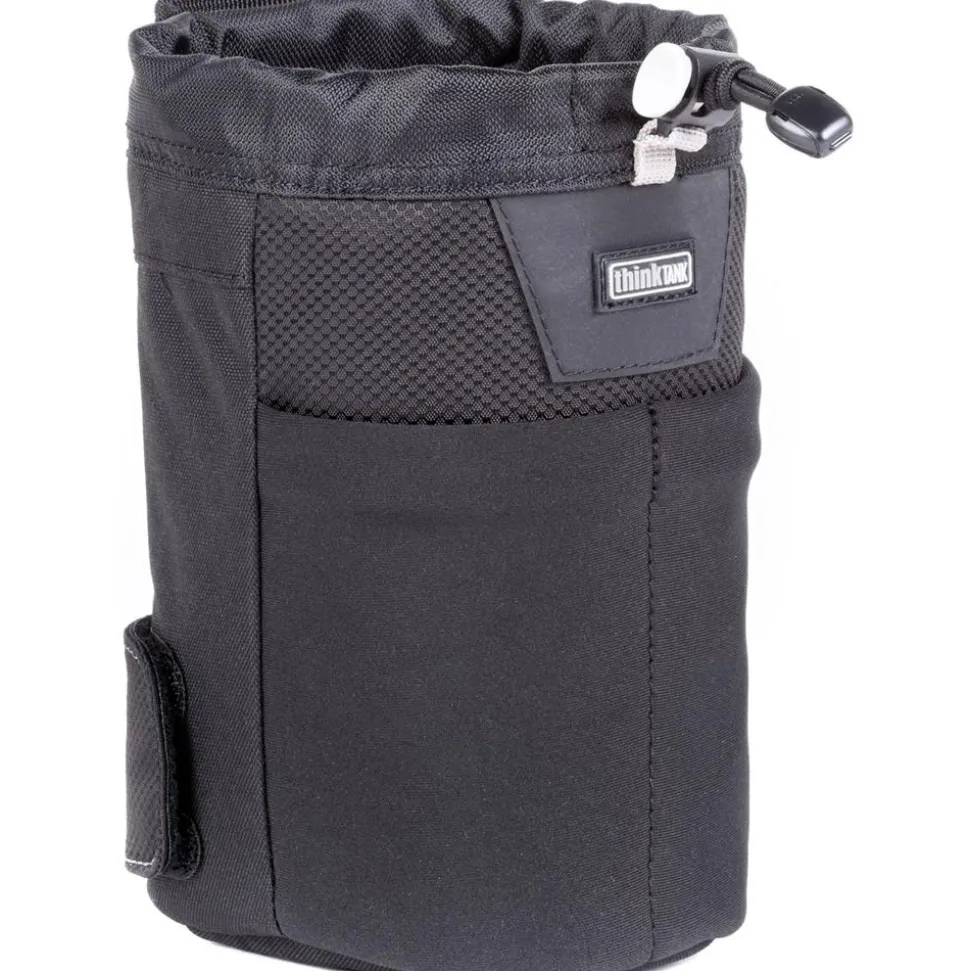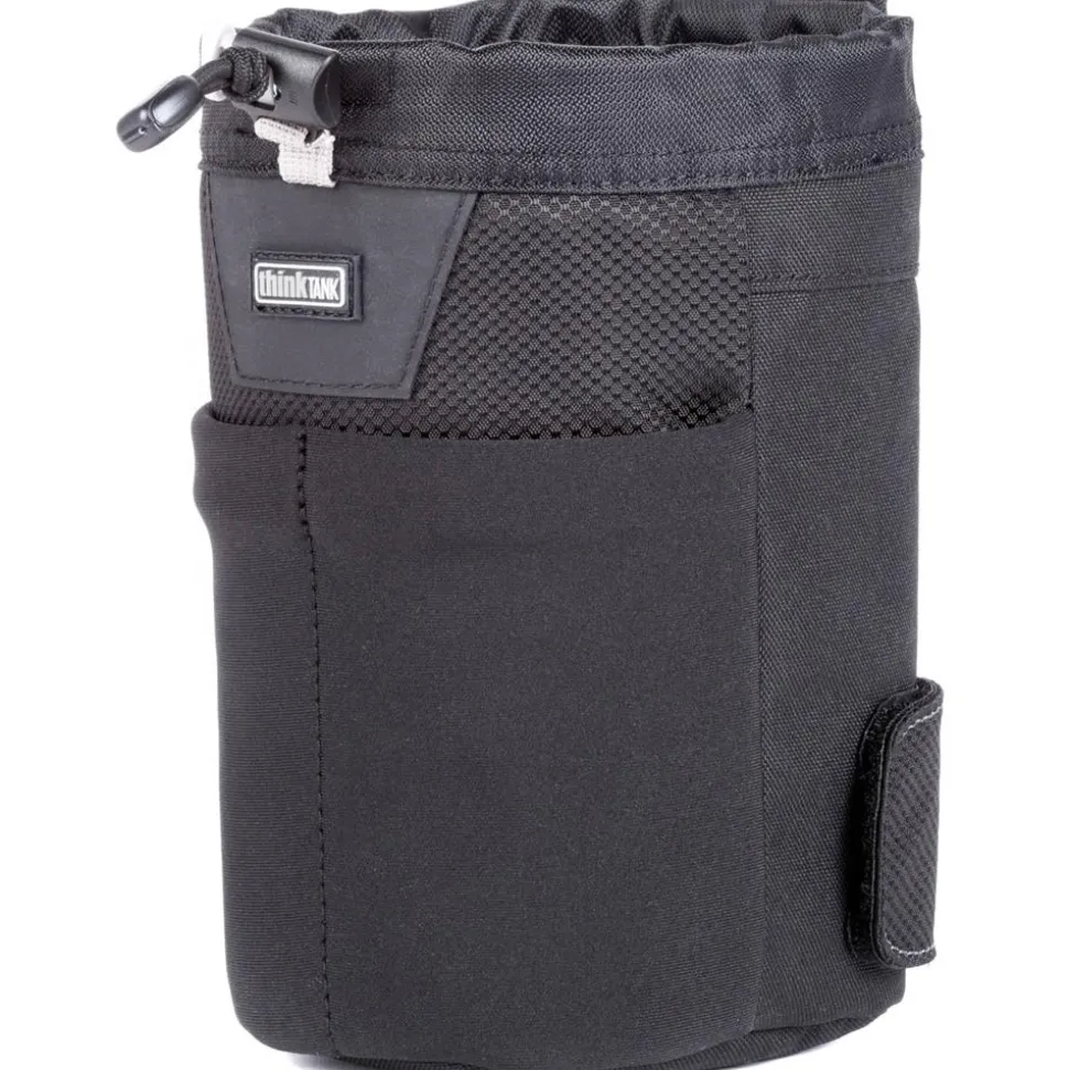 Part of the modular belt system, this black Lens Changer 25 V3.0 from Think Tank is a water-resistant nylon pouch designed for holding compact zoom lenses such as the 24-105mm f/4 and 14-24mm f/2.8 or longer primes like a 105mm macro. The lens case attaches to any optional Think Tank belt or backpack, so you can easily use it while shooting for switching lenses on the go. Made of nylon and polyester, the pouch features a water-repellent coating on the outside for increased durability, and comes with a rain cover in its bottom pocket that can be easily deployed in inclement conditions. Its mouth opens wide for quick access to your gear and closes via a simple drawstring. An outer stretch pocket is available for storing a lens cap or other small item, while a grab handle allows you to easily carry the case with your hands when needed.