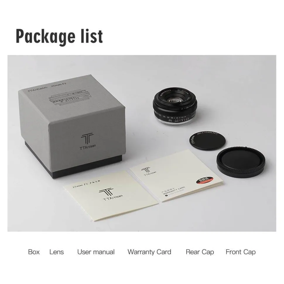 The TTArtisan APS-C 25mm F2 Lens is a compact prime lens designed for use with APS-C cameras. Its 25mm focal length and f/2 maximum aperture offer a wide-angle view and good low-light performance. Solid metal body construction and manual focus design provide durability and precise control. Ideal for landscape, architecture, and street photography.