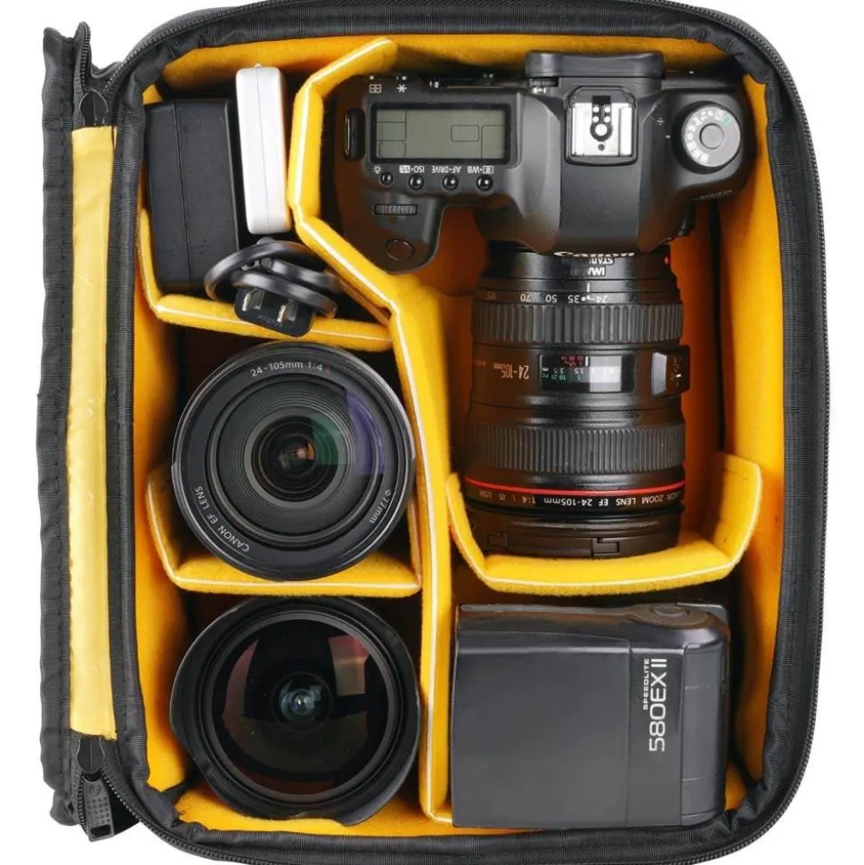 The top lid of the insert bag is designed to fold back and tuck behind the insert bag inside the backpack, to allow you to have it open for easy rear access to your entire kit. Alternatively you can have it closed for extra protection when access isn’t needed, or when you want to take your camera kit out at home and use it as an everyday backpack instead.
