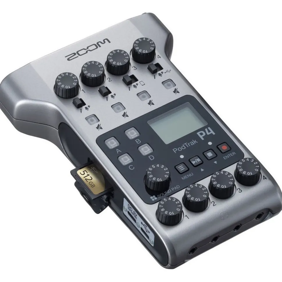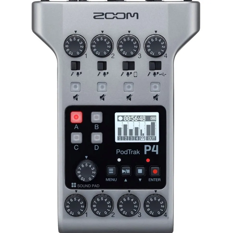 The ultimate tool for multi-person podcasts. Meet the Zoom PodTrak P4. The P4 allows you to create industry standard, polished podcasts wherever you are. Cost effective and compact. You’ll be able to record using up four microphones and provide separate headphone feeds for each guest. If a guest can’t make it. No problem. They’ll be able join your podcast remotely. This can be recorded free from echo so it sounds like they’re in the room.