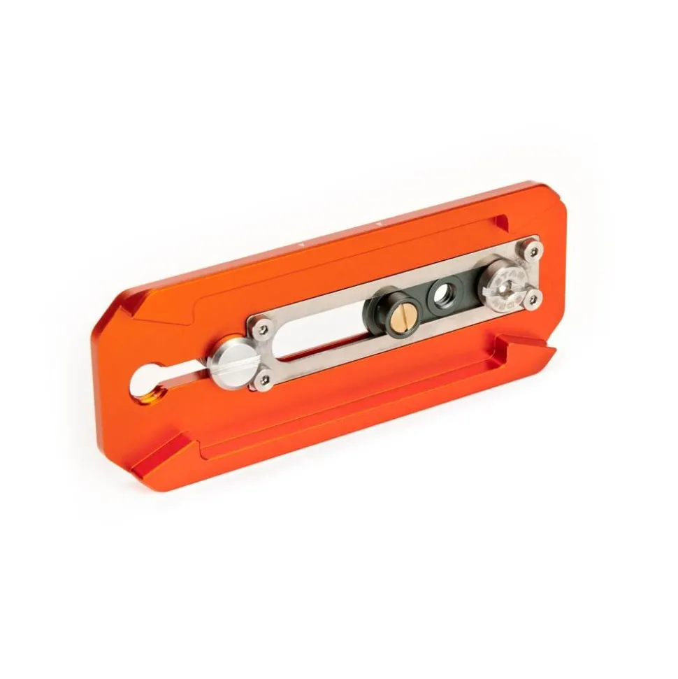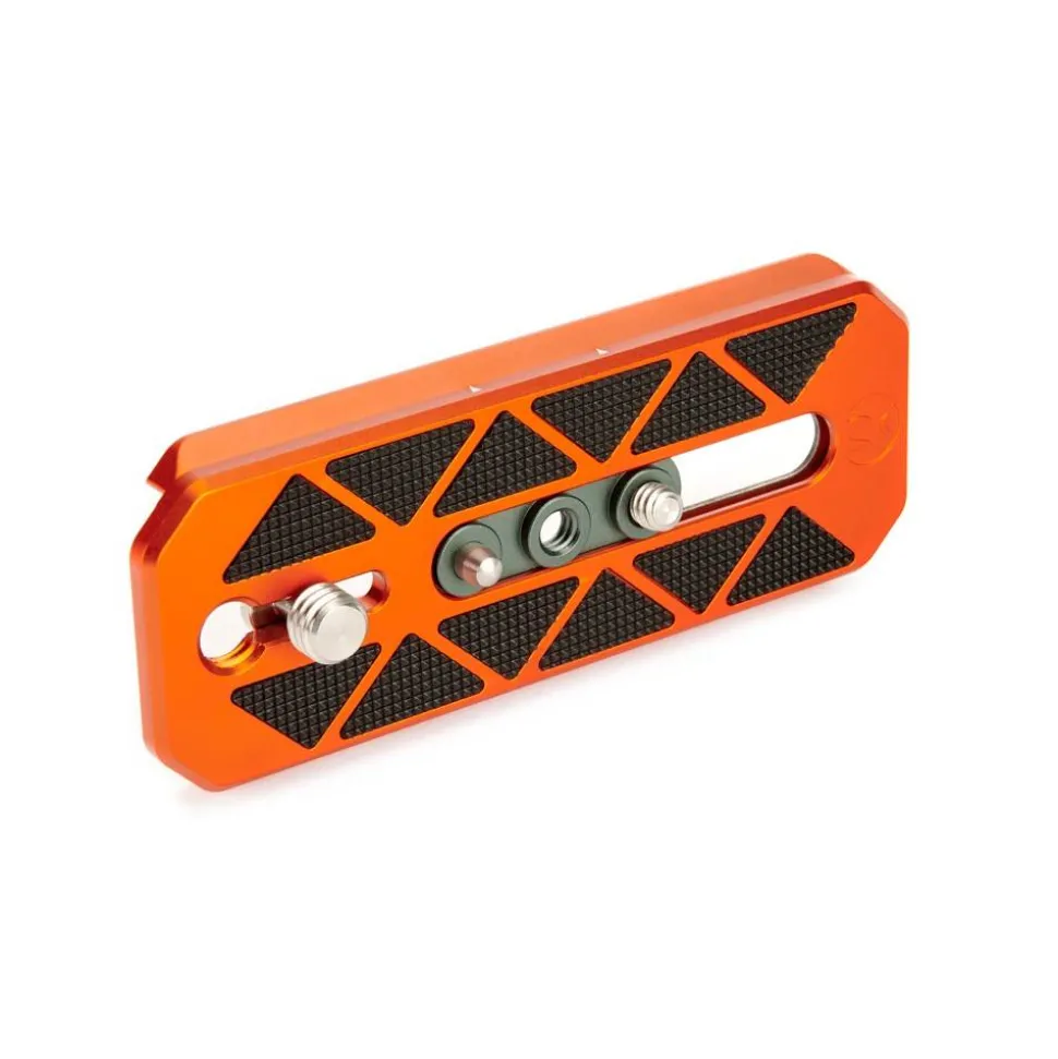The QR-CINE-V is precision engineered using aerospace grade anodised magnesium alloy. It has a moveable mounting section that has both 1/4″”-20 and 3/8″”-16 threads along with a spring-loaded, retractable, locking pin. The plate also features rubberised pads for secure connection to camera bases for better grip.