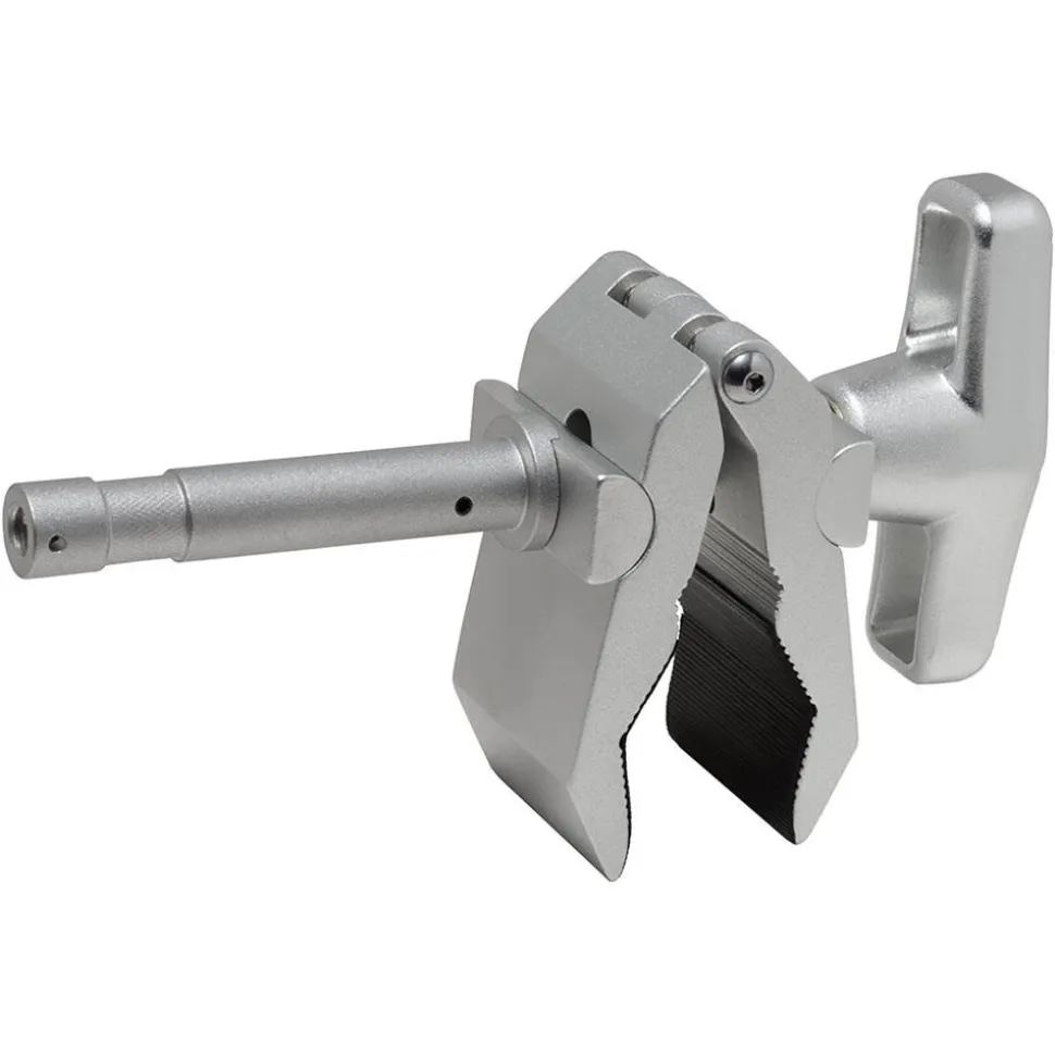 The Heavy Duty Python Clamp with Stud features a 5/8″ baby pin for mounting standard grip and lighting equipment. The bottom of the pin is tapped with a 3/8″-16 female thread so equipment can be mounted directly to it. It also features a heavy duty T-Handle and a high grade 420 stainless steel threaded rod for added utility and durability.