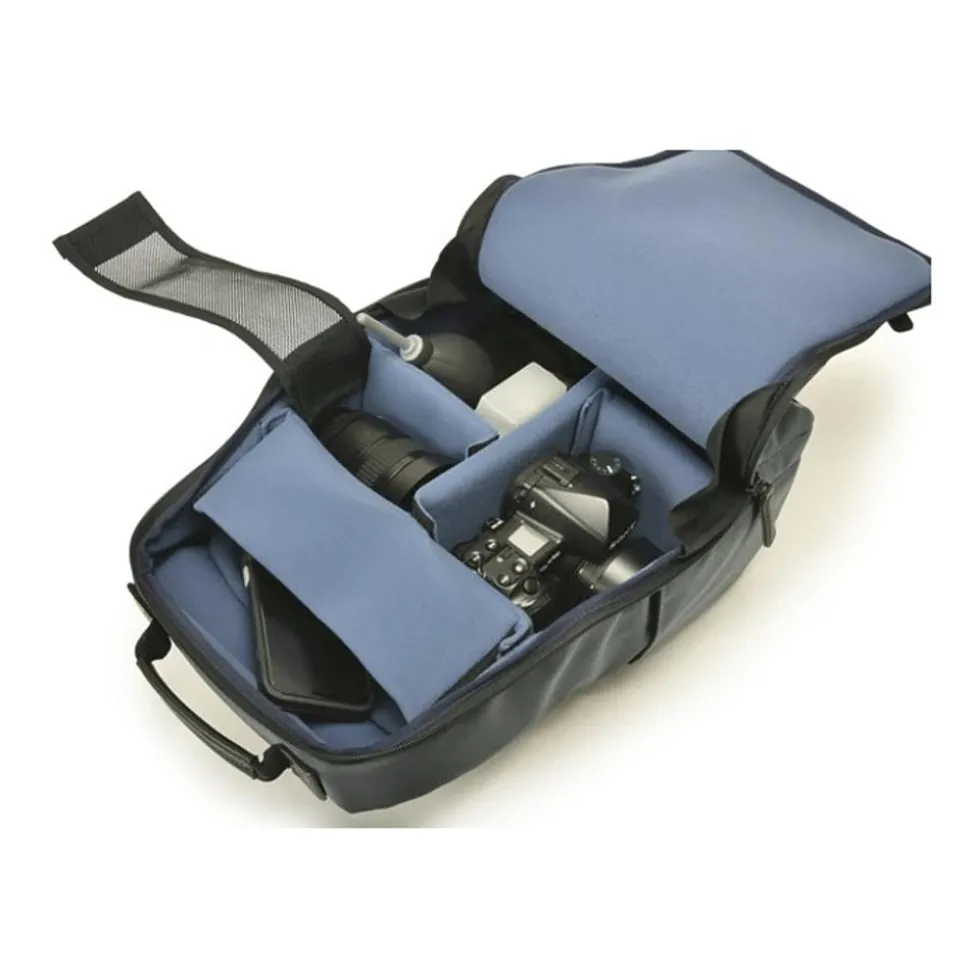 The shape of this backpack is designed to minimize its dead space, achieving a sleek form and practicality. The main compartment can accommodate a mid-sized DSLR camera body, four interchangeable lenses, and a 13-inch laptop. The front flap compartment with a zipper is ideal for storing small items. Furthermore, by storing the handles inside the rear mesh pocket, the backpack can transform into a vertical briefcase-style bag.