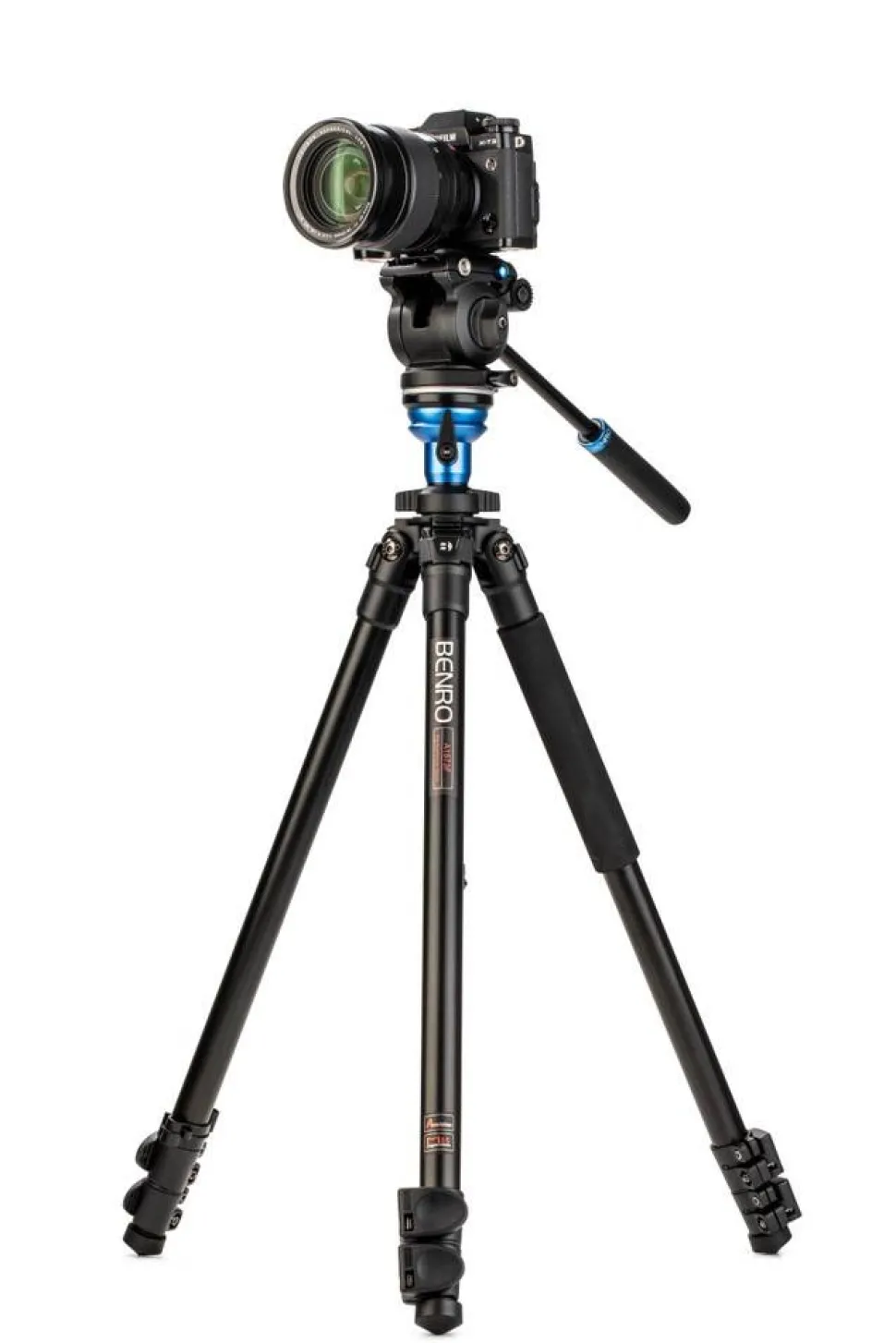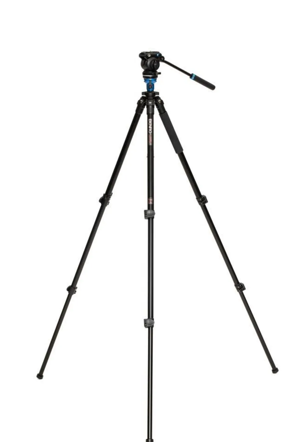 The Benro A1573FS2PRO is a single tube style video tripod with the S2 PRO flat base video head. The center column includes a leveling adapter so that the head can be leveled independently without having to adjust the tripod legs. The tripod also features flip locks, center column weight hook and 3 independent leg position angles. Rubber and spiked feet are both included.