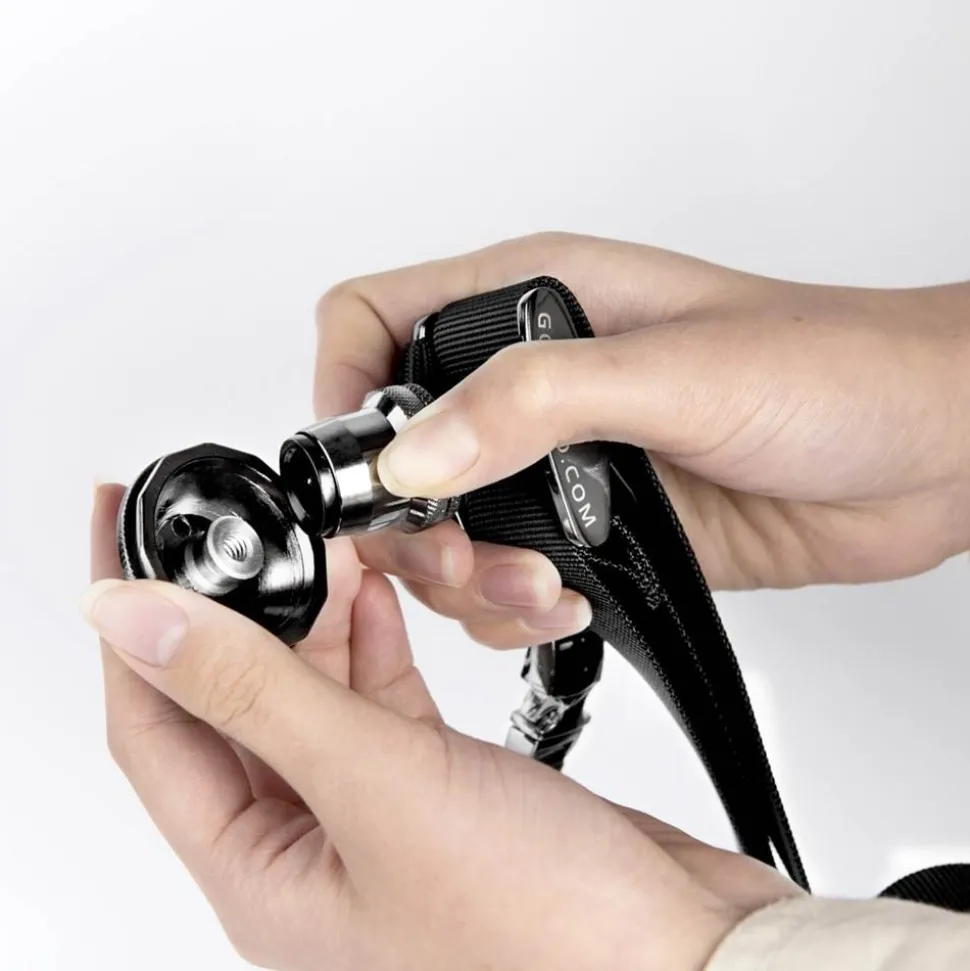 The camera is attached to the strap using circular metal quick release plates. Their large size makes it easy to cinch up tight on to the camera’s tripod mount. The plates are shaped to fit directly onto many arca-compatible tripod heads, eliminating the need to swap plates when shooting from a tripod. Alternatively the centre of the plate feature a standard tripod thread that allows the camera to be directly mounted on a tripod without a quick release plate.