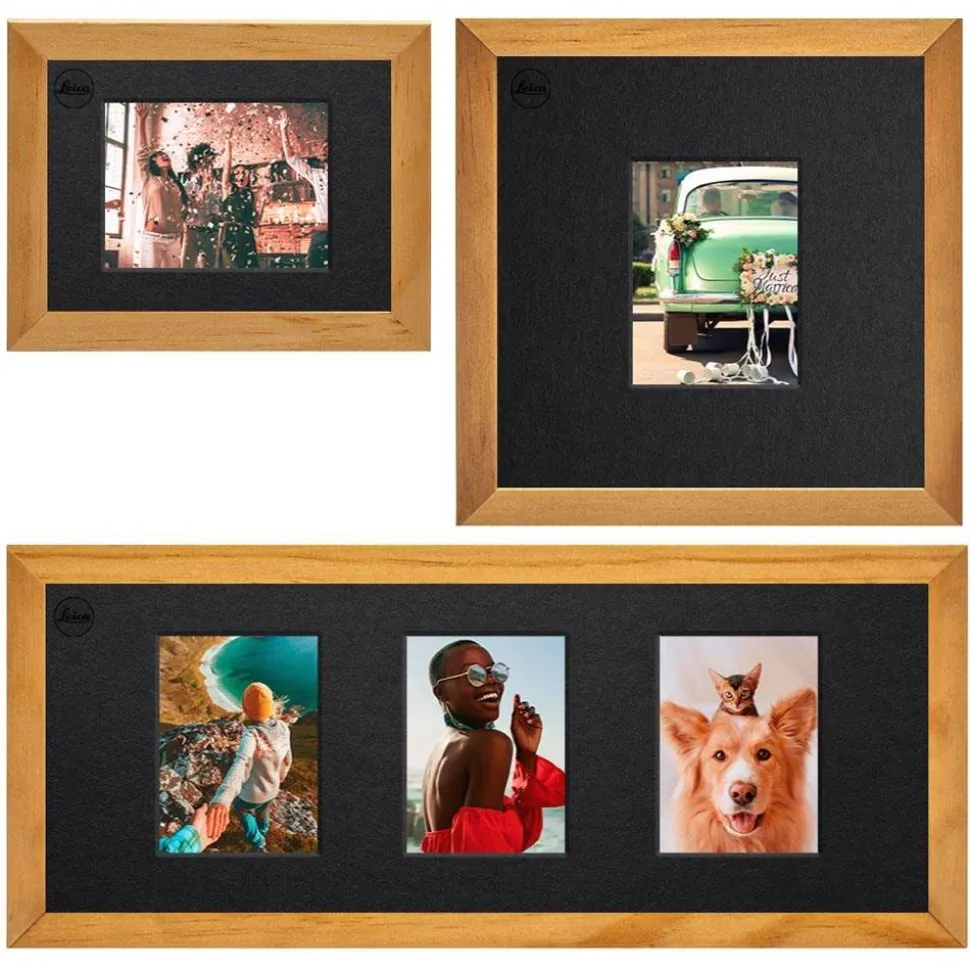 Glassless wooden picture frames, in 3 different sizes including Leica branded passepartouts, to hang on the wall or place on sideboard. Up to 5 Leica SOFORT pictures can be framed in one set.