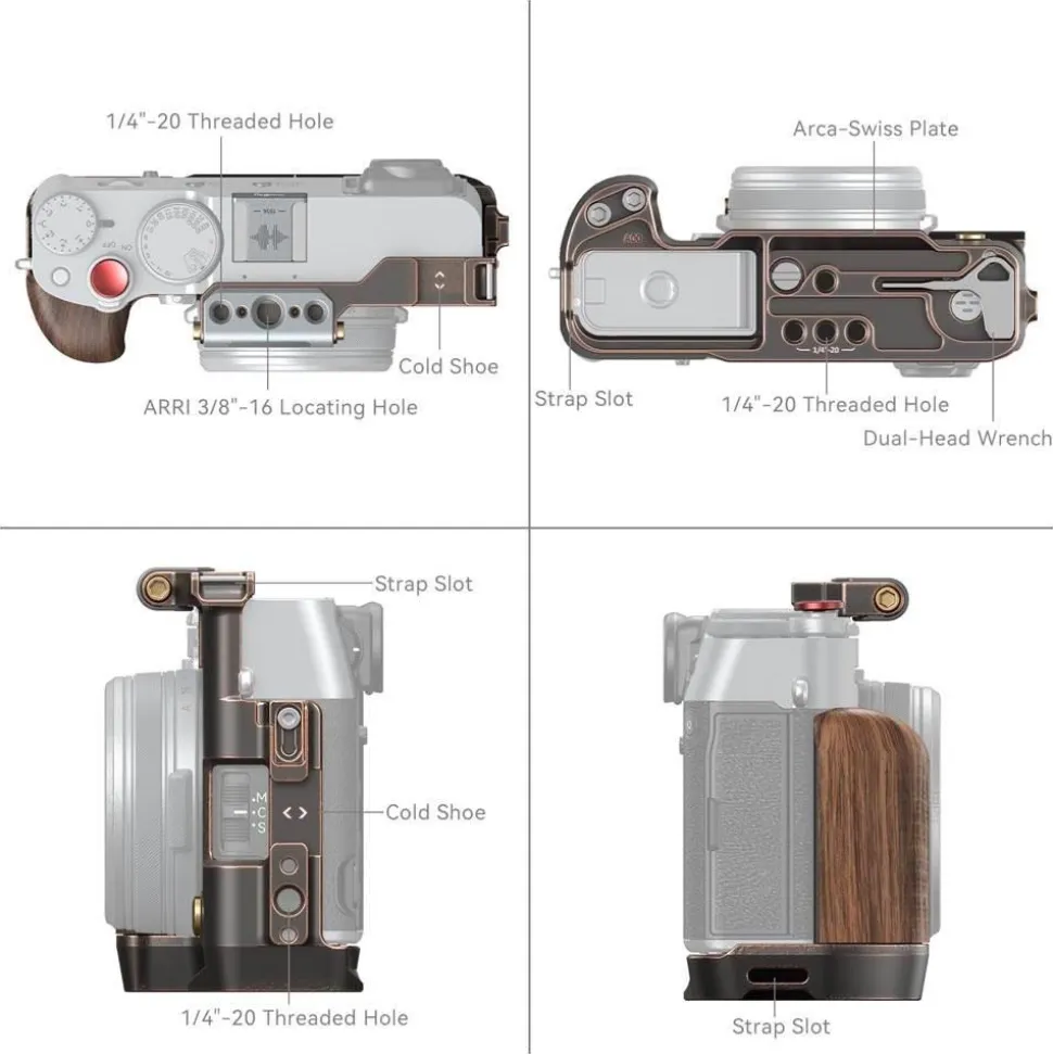 SmallRig “Retro” Cage for FUJIFILM X100VI 4557 is designed to protect the camera and provide multiple expansion interfaces to facilitate content creation. The retro style cage mounts to the camera with a 1/4″-20 screw at the bottom and one side lock on the left, and the silicone pads prevent scratches. The built-in ergonomic wooden grip provides a firm grip. The cage provides unobstructed access to the camera buttons, card slots, LCD screen, MCS switch, battery, etc. The cage has multiple built-in interfaces to meet all your needs: 1/4″-20 threaded hole, ARRI 3/8″-16 locating hole, cold shoe mount, strap hole, etc. It is also compatible with Top Handle (ID: 2736), Microphone (ID: 3487), RGB Video light (ID: 4055), Wrist Strap (ID: 3848), etc. Besides, an Arca-Swiss quick release plate on the bottom allows direct mounting onto Arca-type tripods. There is a built-in double-headed wrench on the bottom for easy disassembly and assembly. The cage comes with the exclusive hot shoe cover imprinted with the “FUJIFILM” sound wave and the year of foundation as our tribute to FUJIFILM. It also comes with a shutter release button to ensure a soft and comfortable finger touch.