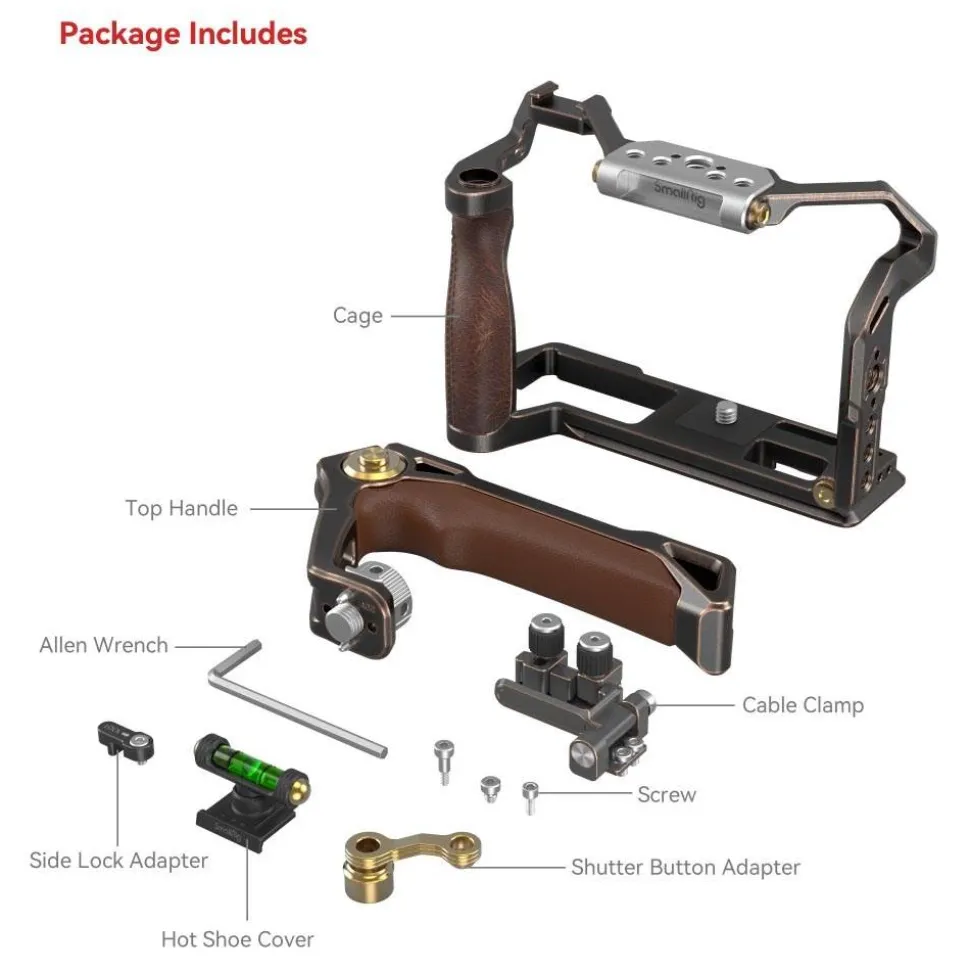 SmallRig Retro Handheld Cage Kit for FUJIFILM X-T5 3872 is designed to facilitate low-angle shooting, protect the camera, and provide accessory mounting points. The kit includes a cage, a top handle and an HDMI & USB-C cable clamp, and a hot shoe cover. The cage is endowed with a new punk style featuring a shutter button adapter frame and an ergonomic leather grip for improved shutter control and grip experience. Accessory mounting points include: 1/4″-20 threaded hole, 3/8″-16 threaded hole, ARRI 3/8″-16 locating hole, cold shoe mount, NATO rail, suitable for magic arm, side handle, top handle, rod clamp, baseplate, LED video light, microphone, etc. With a new press-and-flip design, the HDMI & USB-C cable clamp gives easy access to the camera interface cover while preventing accidental disconnection to ensure stable signal transmission. The ergonomic top handle makes low-angle shooting comfortable and stable. Besides, there is a bubble level in the hot shoe cover for calibration.