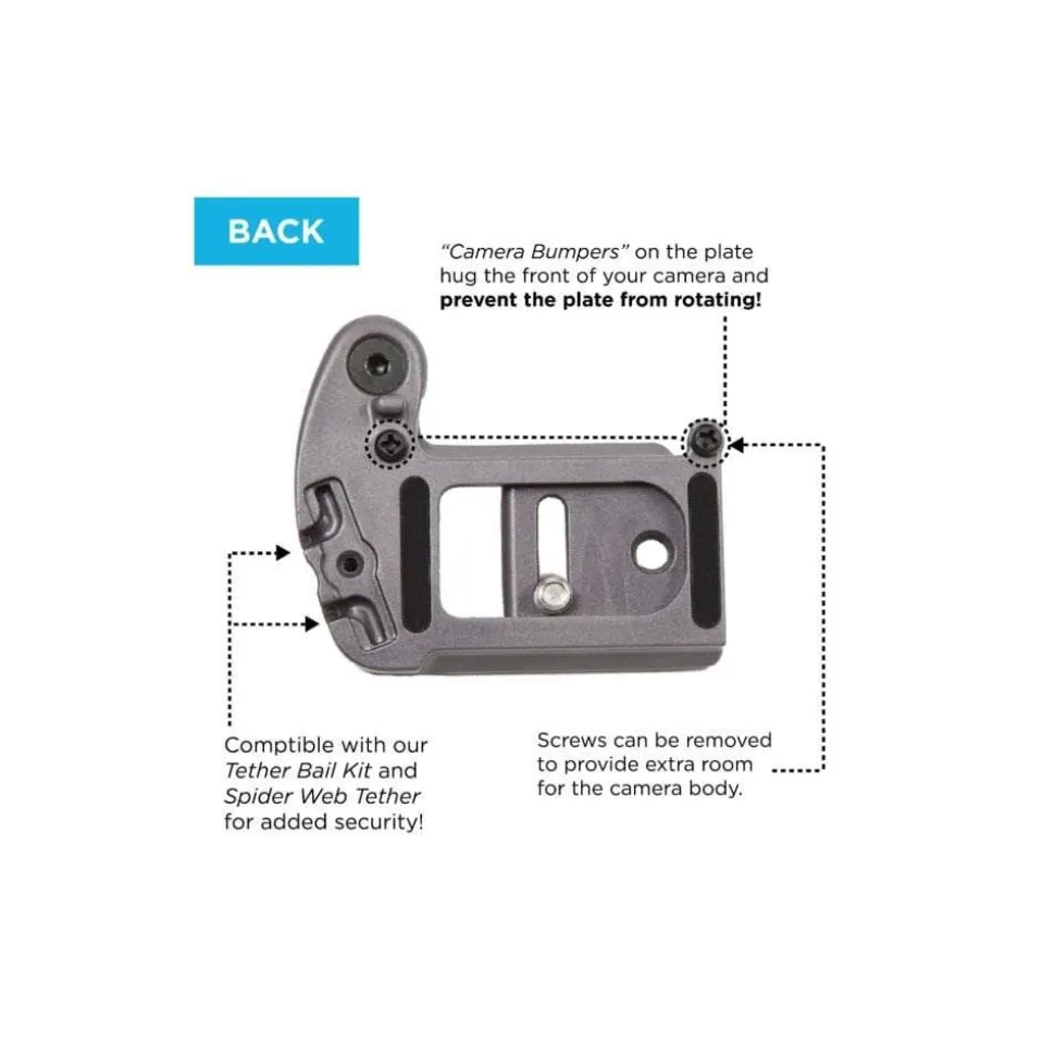 Lightweight and durable, the Spider Mirrorless Camera Plate is designed for mirrorless cameras. The sliding plate design accommodates most mirrorless camera bodies and does not block the battery door. It attaches to the camera’s 1/4″x20 tripod mount and features anti-slip rubber pads for stable, secure installation and an anti-twist Spider pin for added security. The Spider Mirrorless Camera Plate has built-in compatibility for Arca-Swiss style tripods and acts as an Arca-Swiss tripod adapter. It can also be used with other styles of tripod adapter plates.