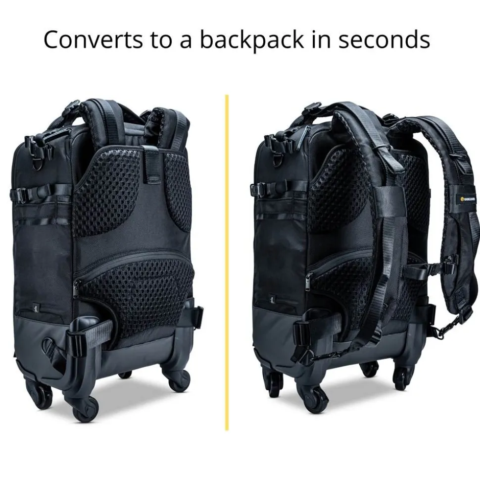 VEO Select 55BT Backpack/Roller Case is a stylish 4-wheel carry-on* trolley that converts to a backpack in seconds and packs a lot more than you would imagine. It will fit 2 pro DSLR/mirrorless cameras, 5-6 lenses (up to 300mm f/2.8), a flash unit, a 13″ laptop with a 9.7” tablet, a tripod and multiple accessories such as memory cards, cables, batteries and a charger
