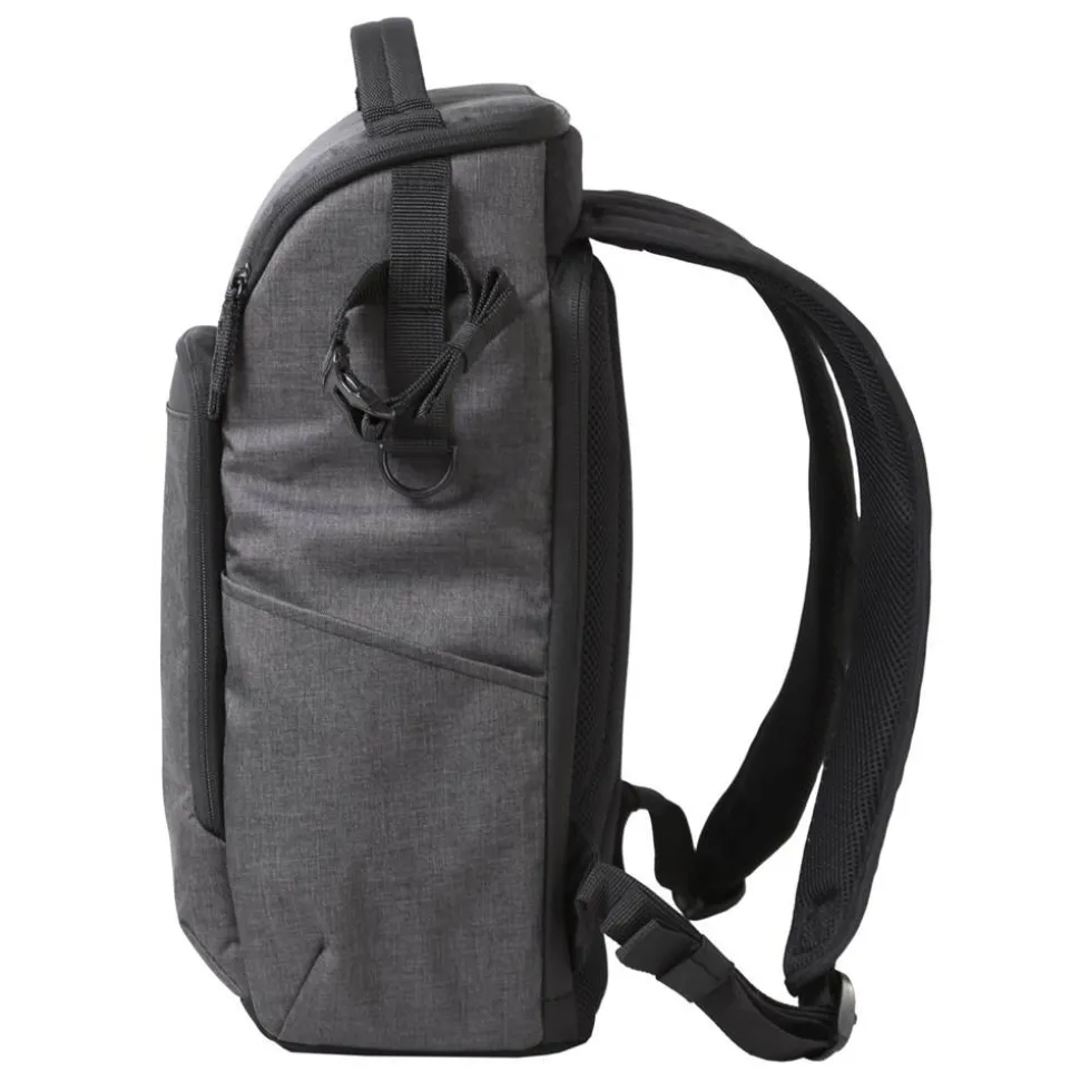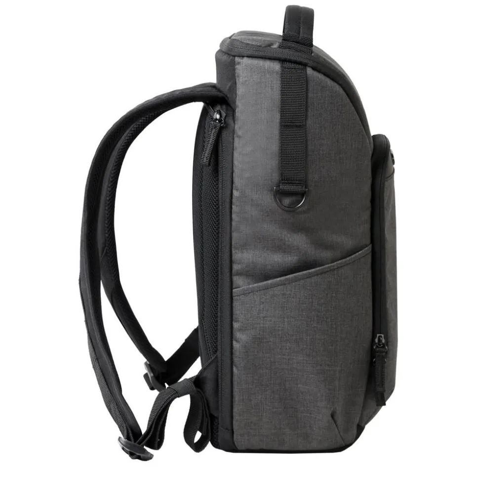 This backpack features two expanding side pockets to carry a travel tripod, and a water bottle.