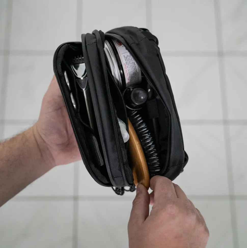 The Large Toiletry Bag is a 3.5-liter travel and daily use toiletries organizer. It has 2 zippered pockets with internal organization in both of them. The front pocket has 2 elastic mesh pockets and 1 large zippered pocket. Inside the zippered pocket, you will find a webbing loop with a snap for keeping rings, hoop earrings, etc secure and organized. The main pocket has 1 zippered pocket and 1 antimicrobial sleeve for keeping your toothbrush clean and securely in place. The internal liner material has a PU coating so if you have any unexpected spills you can easily wipe them away and clean the bag out. On the outside back panel of the Large Toiletry bag, you will find 3 pockets. The middle pocket contains an oversized hook for hanging the Bag. The sleeves on either side are for storing your toothbrush, razor, toothpaste, etc when you are at home or a hotel and let those items dry outside the Bag they also make for quick access. The Large Toiletry Bag comes with 2 secure gatekeeper hardware pieces for use in attaching the Bag to the Accessory Strap loops found on the front of our PRVKE Line or DUO Daypack adding expanded carrying capacity and quick access to your Toiletries. The gatekeeper hardware can also be used to attach our 2 Toiletry Bags together to create a monster of a toiletry bag for those needing extra space or going on long trips.