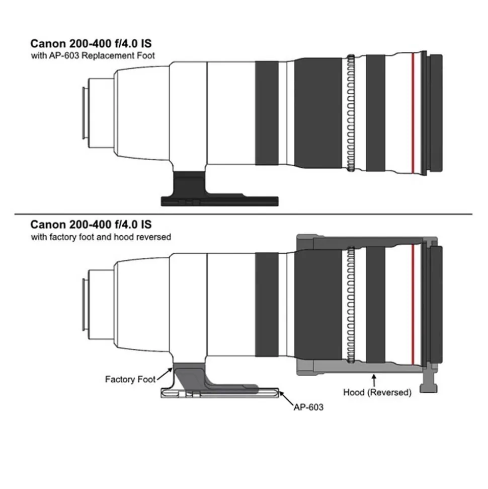 Wimberley custom made low-profile replacement feet replace the factory foot on the rotation collar of your lens and also serve as the Arca-Swiss style quick release plate for your lens.