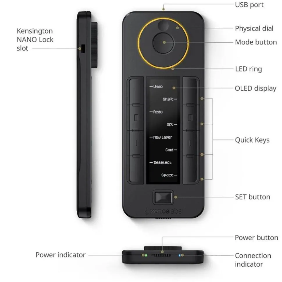 Quick Keys provides versatile connectivity options and can be used wirelessly for up to 53 hours through an uninterrupted peer-to-peer connection to the provided Xencelabs USB dongle. Alternatively, a wired USB-C connection is available, which not only facilitates the usage of Quick Keys, but also serves as a means to charge the device.